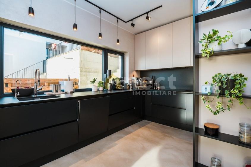 Designul interior este sustinut de finisaje premium, inclusiv microciment, tencuieli decorative de designer si mobilier realizat integral la comanda pentru toate spatiile importante. Ferestrele mari din fiecare camera aduc lumina naturala in centru si deschid spatiile catre exterior.