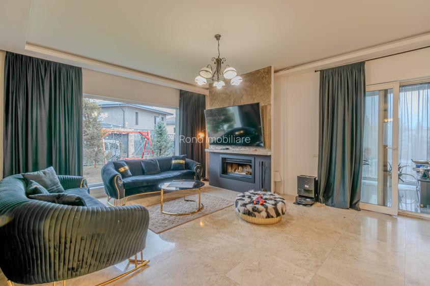 Livingul de aproape 50 mp are șemineu și o zonă vitrată amplă, care se continuă firesc cu o terasă închisă în sticlă — un spațiu perfect pentru serile de iarnă sau pentru un mic dejun în lumina dimineții.