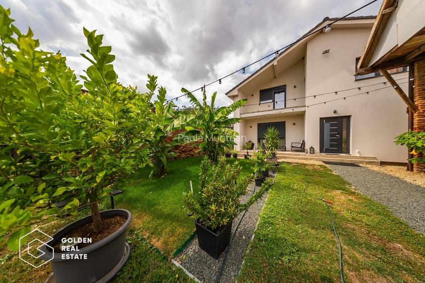 Imobilul este realizat din materiale de foarte bună calitate, începând de la fundație și zidărie, cu izolație exterioară de 15cm, cu geamuri și uși exterioare termopan, cu jaluzele electrice, cu panouri solare pentru apă caldă, cu încălzirea centrală în pardoseală, pe lemne.