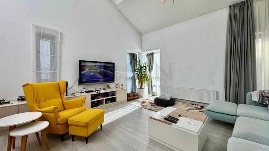 Proprietatea este mobilata cu piese realizate la comanda, incluse in pret, si este dotata cu sistem de alarma, senzori de fum si video interfon.
