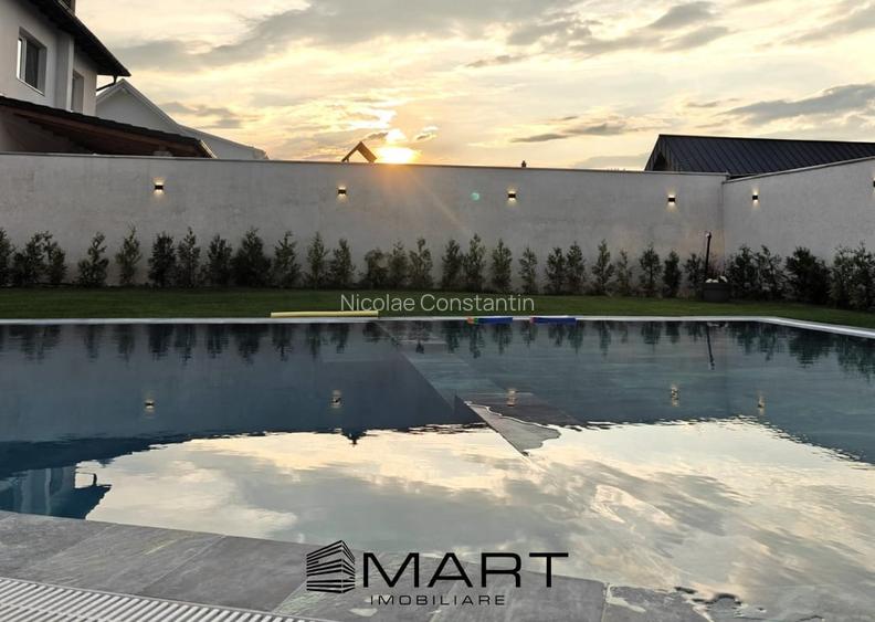 Curtea este amenajata cu zona verde si pavaj, piscina exterioara de 130mc incalzita cu pompa de caldura.