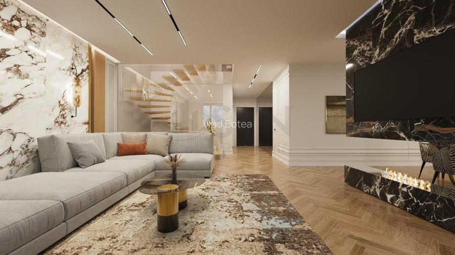 Vila este compartimentata in 5 camere: 3 dormitoare fiecare cu dressing propriu, un birou, un living generos cu zona de dining si bucatarie open space, camera tehnica si 4 bai. La etajul superior se afla o terasa spectaculoasa de peste 90 mp, ideala pentru relaxare, zona lounge sau entertaining.