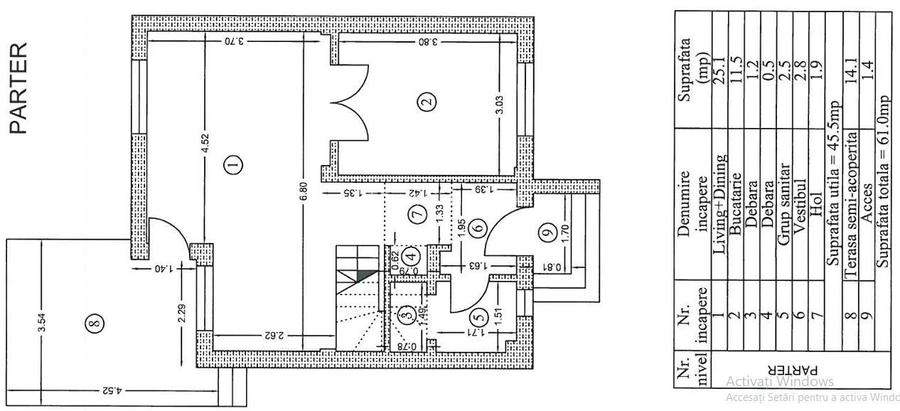 - Parter: living + dining, bucătărie, baie, vestibul, hol, 2 debarale, terasa semi-acoperita cu suprafață total de 61,5 mp