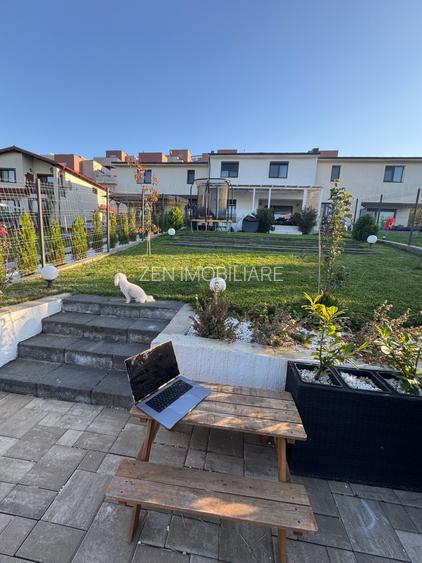 Unul dintre punctele forte ale acestei case este terasa acoperită de 36 mp, realizată cu o structură modernă din lemn, ideală pentru relaxare în orice anotimp. Curtea din spate este deja amenajată, având pomi fructiferi, iluminat exterior, o zonă de barbecue și o căsuță de unelte încăpătoare. În plus, ai la dispoziție apă și curent electric în curte, ceea ce face întreținerea grădinii și organizarea activităților în aer liber mult mai ușoară.