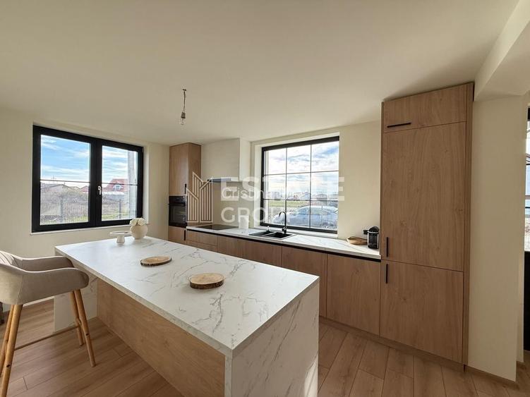 - Bucatarie modern mobilata si utilata cu cuptor si frigider incorportate si insula cu marmura;