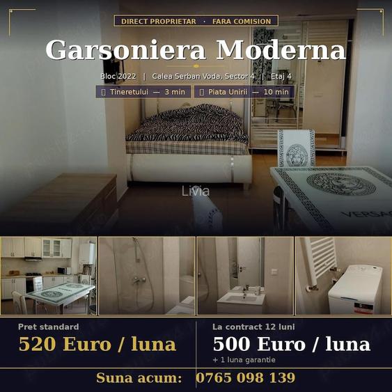 Inchiriez direct, fara comision, o garsoniera spa?ioasa ?i luminoasa, situata intr-un imobil modern construit in 2022, pe Calea ?erban Voda nr. 109-111, Sector 4, la doar 3 minute de mers pe jos de metroul Tineretului ?i 10 minute de Pia?a Unirii. Suprafa?a totala: 39,9 mp Camera de zi: 19,4 mp mobilata complet, pat matrimonial, aer condi?ionat Bucatarie separata: 7,8 mp plita gaz, cuptor electric, cuptor cu microunde, zona dining Baie: 3,9 mp cabina du?, ma?ina de spalat inclusa Hol cu dressing: 3,6 mp u?i culisante cu oglinzi Balcon: 5,2 mp Dotari ?i siguran?a: Centrala termica proprie Aer condi?ionat Detector de gaz Lift nou, paza ?i supraveghere video 24 7 Acces securizat in imobil Posibilitate parcare subterana (contra cost) Pre?: 520 euro luna SAU 500 euro luna la contract de 12 luni + 1 luna garan?ie Contact direct proprietar: Programa?i o vizionare! ID anun? : 1776674345