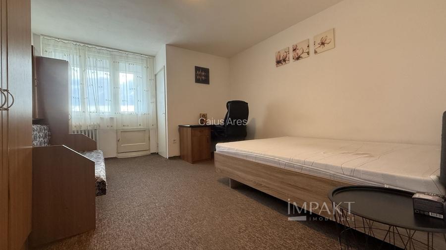 Garsoniera este situata la etaj intermediar 6/10, dispune de orientare vestica si implicit de soare pe tot parcursul zilei. Suprafata utila este de 27m2 fiind compusa din 1 camera, hol, bucatarie, baie, camara, balcon inchis cu geamuri termopan. Dispune de finisaje medii, gresie si faianta, usa metalica la intrare, mocheta si se preda complet mobilata si utilata conform fotografiilor de prezentare (masina de spalat rufe, frigider, aragaz, cuptor cu microunde, etc.). Imobilul din care face parte dispune de o casa a scarii extrem de ingrijita si generoasa, 2 lifturi, intrare pe baza de interfon cu cartela.