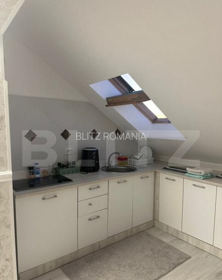 Blitz va propune spre vanzare o garsoniera situata la etajul 6 intr-un bloc nou este ideala pentru cei care cauta un spatiu modern, complet mobilat si utilat, oferind tot confortul necesar intr-o locuinta bine compartimentata. Garsoniera este luminoasa si aerisita, avand o organizare practica a spatiului. Imobilul este compartimentat astfel: holul de la intrare este spatios, oferind suficient loc pentru un cuier sau un mic dulap pentru depozitare. Finisajele sunt de calitate, cu pardoseala laminata de culoare deschisa care creeaza o atmosfera primitoare. Bucataria este amenajata eficient, cu mobilier modern din lemn, spatii de depozitare si electrocasnice integrate. Mobilierul compact maximizeaza spatiul disponibil, iar placile de faianta protejeaza peretii si adauga un plus estetic. Totul este pregatit pentru a gati cu usurinta.Baia este complet utilata. Camera principala este aerisita, cu un design modern si elegant. Patul matrimonial este confortabil, iar ferestrele de mansarda ofera lumina naturala, creand o senzatie de spatiu deschis. Pardoseala este din parchet laminat, in tonuri deschise, iar camera include si un birou, perfect pentru activitati de lucru sau studiu. De asemenea, exista un spatiu generos pentru depozitare, atat sub forma de dulapuri cat si rafturi. Cod oferta / ID BLITZ: P133310 Id intern: P133310 Confort: 1 Tip imobil: Bloc de apartamente Numar Bai: 1 Nr. locuri parcare: 1 Publicat prin