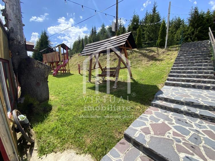 Pensiunea are o suprafata utila de aprox 343mp, iar terenul aferent are o suprafata de 500mp. Separat de acest spatiu mai exista o terasa superba cu vedere spre munti in suprafata de 95mp si 3 balcoane orientate de asemenea catre munti si padure in suprafata de aproximativ 30mp. In incinta terenului mai exista doua corpuri separate, locuri de joaca si un ciubar care poate fi folosit in orice perioada a anului fiind amenajat intr-un spatiu inchis cu pereti de sticla pentru a nu obtura vederea. Primul corp este compus dintr-un living cu bucatarie open space si o baie, iar in celalalt corp se afla receptia cu deschidere direct la strada principala.