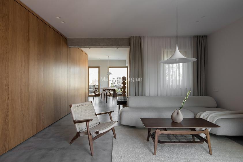 La nivel superior interventia pe spatiu si compartimentari a fost minima. Avem parte de o zona de relaxare si socializare, unde regasim o canapea Gogan By Moroso, completate de doua scaune si un fotoliu semnate de Hans J. Wegner pentru celebrul producator Carl Hansen & SON. Dinning-ul poarta aceeasi semnatura ca si zona de relaxare.