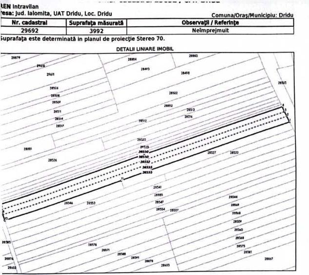Oportunitate Investitie: Teren 3.992 mp Dridu Certificat Urbanism P+2E (Dec. 2025) Vand teren intravilan in localitatea Dridu, judetul Ialomita, cu o suprafata totala de 3.992 mp, rezultat prin alipirea a 3 loturi. Proprietatea beneficiaza de o pozitionare strategica si documentatie completa, fiind pregatita pentru demararea unui proiect rezidential sau comercial. Localizare si Conectivitate: Bucuresti (Centru): ~50 km (aprox. 45-55 min. cu masina), acces rapid via DN1/A3 sau prin Urziceni. Fierbinti-Targ: Doar 7 km (aprox. 8-10 min.), oferind acces rapid la facilitatile orasului vecin. Lacul de acumulare Dridu: La doar cateva sute de metri, o zona deosebita pentru agrement si relaxare. Avantaje Urbanistice (Conform CU Dec. 2025): Regim de inaltime: P, P+1, pana la P+2E ideal pentru vile spatioase sau un mini-ansamblu de locuinte. Caracteristici Teren: Configuratie: Dubla deschidere (fata/spate) permite parcelare eficienta sau acces facil pentru utilaje. Deschidere la drumul principal: 14,8 m (drum pietruit). Utilitati: Curent electric disponibil in zona. Vecinatati: Chiar in fata gradinitei si a salii de sport; zona cu locuinte noi, linistita si in plina expansiune. Terenul este deja alipit, cu cadastrul unificat in curs de finalizare. Pret: 6 /mp (Negociabil) Contact: Neagu Lucian | 07******13