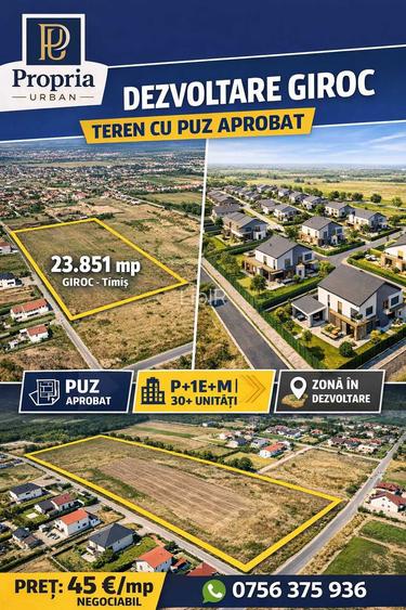 Oportunitate dezvoltare -Teren 23.851 mp cu PUZ Giroc front 110 ml