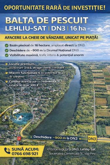 Oportunitate RARA de investitie Balta de pescuit Lehliu-Sat | DN3 | 16 ha Se ofera spre vanzare afacere la cheie, prin preluarea societatii SC Vag Pesc, care administreaza Bazinul Piscicol Lehliu-Sat 1, o locatie exceptionala si greu de intalnit pe piata. Pozitionare premium: Bazin piscicol de 16 hectare, situat direct la Drumul National DN3, cu deschidere de aproximativ 900 metri, vizibilitate excelenta si acces facil. Un astfel de amplasament este foarte rar disponibil si ofera un avantaj major fata de alte balti de pescuit. . Afacere functionala, cu potential mare de crestere Ideala pentru pescuit recreativ, competitii, evenimente sau dezvoltare zona de agrement. Locatia si suprafata permit extindere si diversificare a activitatilor, fiind potrivita atat pentru antreprenori, cat si pentru investitori. .Conditii avantajoase: afacere la cheie redeventa lunara: 300 administrare facila activitate usor de scalat . Investitie cu perspectiva pe termen lung Astfel de proprietati, cu deschidere mare la DN3 si suprafata de 16 ha, apar foarte rar pe piata, iar oportunitatea de preluare este limitata. .Se accepta variante .Nu raspund la mesaje pt ca timpul este limitat contact telefonic pentru detalii . Pentru informatii suplimentare si discutii directe, va rog sa ma contactati telefonic. 07******21 Locatia mai detine o casa pe malul lacului cu deschidere de 10 m lungime la balta cu suprafata construita de 75 mp cu un teren de