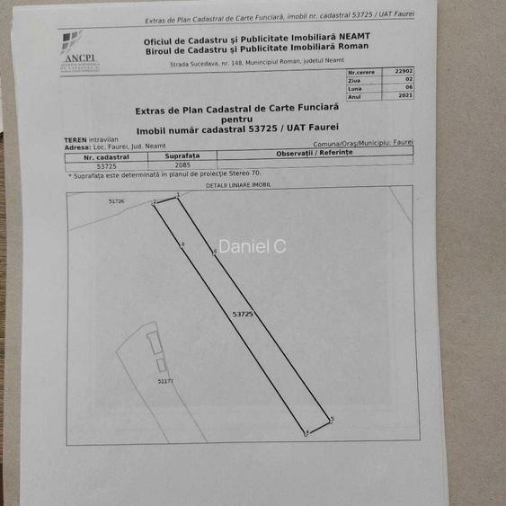 Vand teren intravilan intre case, Comuna Faurei, DJ 157 la nr. 806 dupa intersectia catre Micsunesti la aproximativ 1 km partea stanga catre dumul spre Margineni-Piatra Neamt. Suprafata 2085 mp, cu livada de pruni, ciresi si nuci.