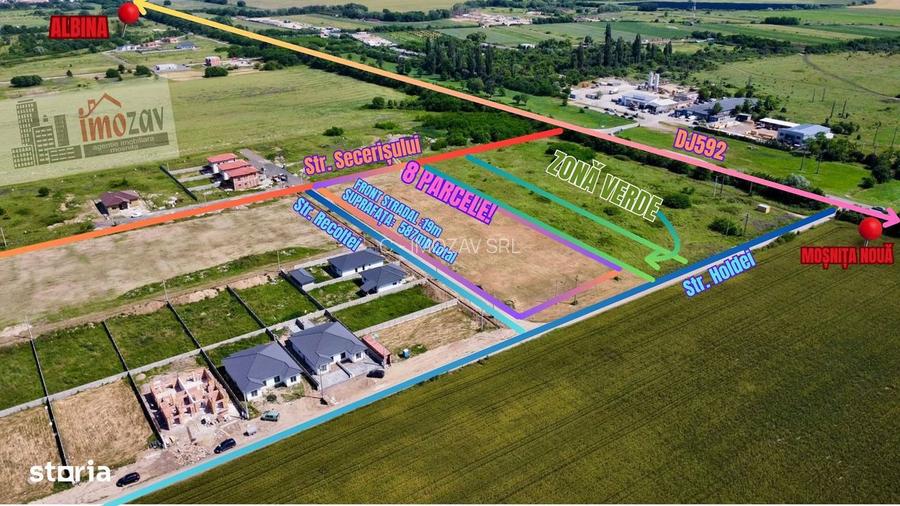 !!!5 VANDUTE-3 RAMASE!!!Firma Imozav ofera spre vanzare 8 parcele de teren intravilan, ideale pentru constructia de locuinte individuale sau duplexuri, situate intr-o zona in plina dezvoltare din Mosnita Noua.Utilitati pe parcela: CurentUtilitati peste drum (NECESITA RACORDARE!) Apa Canalizare Gaz Detalii parcele: Suprafete: 731 mp, 722 mp si 739 mp (restul de 6) Front stradal: 19m pentru fiecare parcela Pret: 65.000 EUR / parcela Localizare excelenta:Situate pe strada Recoltei, parcelele beneficiaza de: Acces facil la DJ 592, drumul judetean modernizat la 4 benzi, care leaga Timisoara de Mosnita Noua, asigurand un trafic fluent si sigur Proximitate fata de Mosnita Noua, unde se gasesc toate facilitatile necesare: complexuri comerciale, scoli, gradinite si alte servicii esentiale Acces rapid catre AlbinaOportunitate de investitie: Aceasta oferta reprezinta o oportunitate excelenta pentru cei care doresc sa construiasca o locuinta intr-o zona linistita, dar bine conectata la facilitatile urbane, sau pentru investitori interesati de dezvoltarea unor proiecte rezidentiale intr-o comunitate in expansiune.Contactati-ne pentru mai multe detalii sau o vizita la locatie