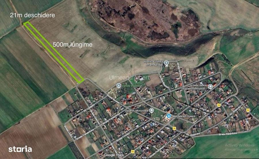 Se ofera spre vanzare un teren generos, cu o suprafata de 10.500 mp, situat in localitatea Popesti, apartinand de comuna Vasilati judetul Calarasi, intr-o zona linistita si in plina dezvoltare. Terenul este potrivit pentru [casa de vacanta sau locuinta permanenta], cat si pentru activitati agricole ori investitii pe termen lung. Zona este caracterizata prin aer curat, peisaj deschis si vecinatati aerisite, fiind ideal pentru cei care isi doresc liniste, dar si acces relativ rapid catre bucuresti [a 2-a poza indica distanta si timpul parcurs catre autostrada A0] Terenul este in prezent extravilan, cu documentatia deja depusa pentru a trece in intravilan.Deschidere 21m cu o lungime de 500m.