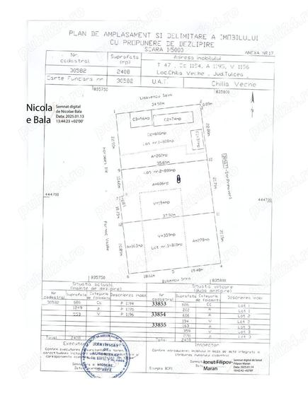 Vand proprietate situata in Delta Dunarii, in intravilanul com.Chilia Veche,str.Primaverii,nr.8 ,avand o suprafata de teren de 1600mp impartita in 2 loturi de cate 800mp.Fac mentiunea ca proprietatea NU se afla pe malul vreunei apE.Apa si curent electric pe limita de prorietate. Ideal pentru o investitie de suflet mai ales pt.cei impatimiti in ale pescuitului si anume constructia unei case de vacanta , amplasarea de casute din lemn sau containere de locuit.Zona reprezinta unul dintre ultimele locuri din Romania unde se mai poate prinde peste pe salbatic.Locuri de pescuit sunt nenumarate fluviul Dunarea(Chilia), bratul Tataru,bratul Babina,bratul Cernovca,canalul Stipoc,canalul Radacinoase,canalul Iacubova, lacurile:Argintiu,Babina ,Lungu, Merhei, Matita, Rosca, Statia 11,etc.Sunt unic proprietar si detin toate actele necesare vanzarii .Pretul fix solicitat este de 6500euro pt fiecare dintre cele 2 loturi.Va rog sa sunati doar daca sunteti cu adevarat interesati sa cumparati.Va multumesc! Tel. ID anun?