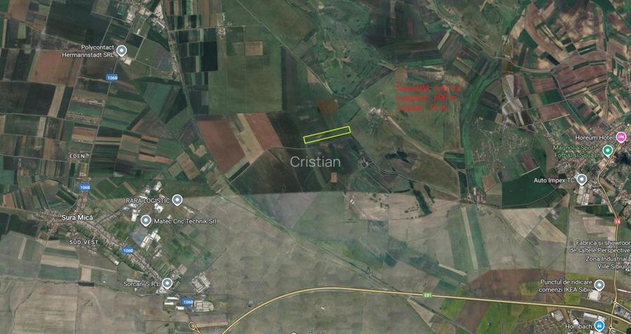 Persoana fizica vand teren extravilan agricol in Sura Mica, la limita administrativa cu mun. Sibiu, in suprafata de 36.200 mp, cu urmatoarele dimensiuni: - latura sud - 695,5 m - latura est - 55,5 m - latura nord - 668,5 m - latura vest - 53,7 m. Pret de vanzare - 54.300 euro.