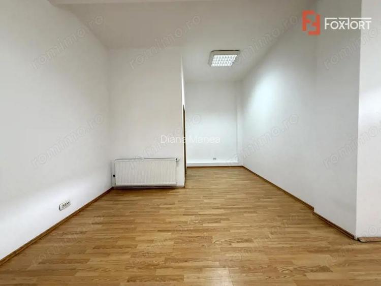 Spatiu birou cu 2 camere de inchiriat in Timisoara, zona Telegrafului. FOXFORT propune spre inchiriere un spatiu de birou cu 2 incaperi, situat in Timisoara, zona Telegrafului, la doar 10 minute de centru. Spatiul este la Parter intr-o cladire cu regim de inaltime Parter + 2 Etaje, avand 2 camere si 1 baie. Suprafata utila este de 50 mp si este compartimentat. Structura este de beton, material zidarie de caramida. Dotari: spoturi, lumina naturala, curent electric, apa, canalizare, gaz, telefon, acces internet, fibra optica, loc de parcare public, supraveghere video. Contorizarea utilitatilor este separata. Incalzirea se realizeaza prin intermediul centralei proprii, prin calorifere, iar spatiul dispune si de aparat de climatizare (A.C.). Finisaje interioare: - Usa intrare: PVC; - Usi interioare: panel; - Tamplarie ferestre: pvc, termopan; - Podele: parchet, gresie. Pretul este de 400 + comisionul standard al agentiei. Se accepta ca si modalitate de plata surse proprii. Te invit la o vizionare. Indicator performanta energetica: Clasa A ID intern: C9408 ID anun? : 1772448018
