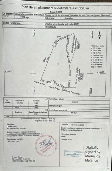 Teren de vanzare in comuna Valea Iasului, sat Cerbureni, judetul Arges. Suprafata: 2700 mp Deschidere: 100 m Facilitati: apa, canal, gaze, internet, strada in curs de asfaltare Pret: 18 euro / mp negociabil Persoana contact: Diaconu Georgian Nr. Telefon: 07******37
