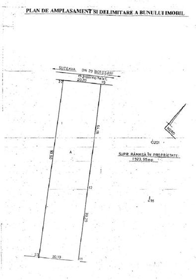 Teren la drumul European Botosani – Suceava, in suprafata de 1925mp, la asfalt, deschidere de 20.20, curent pe teren, apa, gaz la limita de proprietate, pretabil pentru casa sau afacere ( service auto, spalatorie, etc ).