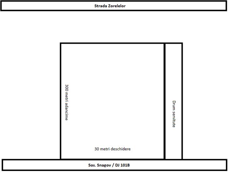 Terenul are forma unui dreptunghi, deschidere 30 m adancime 300 m + drum de servitute pe toata adancimea, utilitati