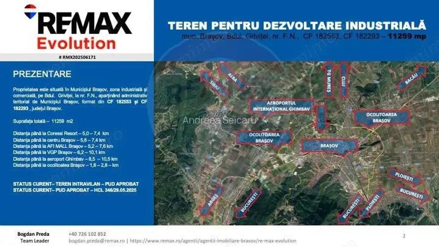 Pre? vanzare: 1.000.000 Modalita?i de plata: achizi?ie in tran?e (maximum 18 luni de la ob?inerea AC) Localizare ?i Avantaje Zona - Pozi?ionat strategic pe Bdul. Grivi?ei, municipiul Bra?ov (CF 182553 ?i CF 182293). - Acces facil la principalele artere ale ora?ului ?i conectivitate rapida cu Ocolitoarea Bra?ov (2 km). - Distan?e cheie: -Coresi Resort: 57 km - AFI Mall: 57 km - Centrul Bra?ovului: 57 km - VGP Bra?ov: 610 km - Aeroport Ghimbav: 810 km -In proximitate: Dedeman, CTP Dhiel, Karl Heinz Dietrich International, Recobol, ceea ce asigura un ecosistem activ pentru logistica, comer? ?i industrie. Date Tehnice - Suprafa?a totala teren: 11.259 mp - Status juridic: intravilan, PUD aprobat (HCL 346/29.05.2025) - Func?iune aprobata: dezvoltare industriala/comerciala - Coeficien?i urbanistici conform PUD aprobat oportuni pentru proiecte industriale, logistice sau mixte. Oportunitate Investi?ionala Acest teren reprezinta un punct de ancora pentru dezvoltari industriale sau comerciale in una dintre cele mai dinamice zone ale Bra?ovului. Pozi?ionarea langa jucatori mari din domeniu, accesul facil la infrastructura ?i aprobarile urbanistice deja ob?inute fac din acest teren o investi?ie cu randament ridicat ?i risc redus. Structura de plata flexibila cu tran?e de maximum 18 luni de la ob?inerea autoriza?iei de construire ofera investitorului predictibilitate financiara ?i libertate de planificare a cash-flow-ului. ID anun? : 1758150999