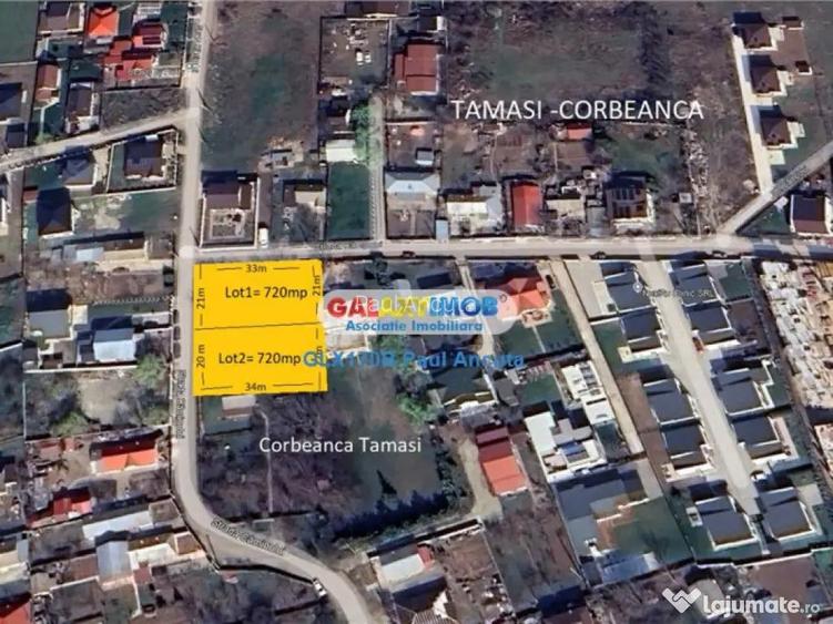 De vanzare 2 loturi casa in suprafata de 720 mp fiecare, amplasate in Corbeanca Tamasi pe str Caminului cu str Campului. Lot 1= 720 mp cu acces dublu la 2 strazi : acces de 20 m la strada Caminului si acces de 33 m la str Campului Lot 2= 720 mp cu acces de 20 m la str Campului. Ambele loturi sunt la sosea asfaltata cu toate utilitatile:apa,canal,curent,gaz,etc.Terenuri amplasate langa case noi construite cu acces rapid la soseaua Unirii unde sunt magazine,scoala,gradinita,statie masina spre Bucuresti,iar la 2 km spre Buftea se face acces rapid pe noua Centura a orasului Buftea cu Acces in Nodul de Autostrada A0 la Mogosoaia.Loturile au destinatii de construit case cu P 1 M : POT 30%: CUT 1. Pret 80 e/mp Informatii eficienta energetica: