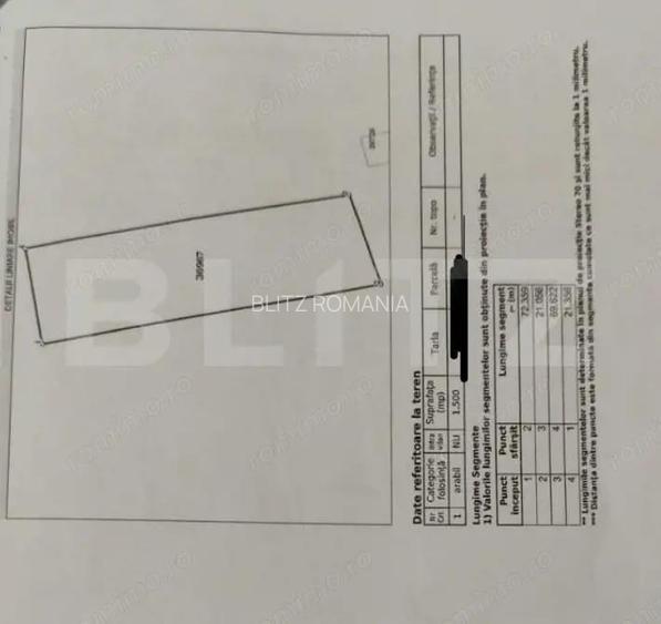 Blitz va ofera spre vanzare teren extravilan, cu suprafa?a de 1.500 mp, inscris in Carte Funciara, cu documenta?ie cadastrala completa ?i acte in regula. Caracteristici teren: Suprafa?a totala: 1.500 mp Categoria de folosin?a: Extravilan Curent electric disponibil in zona Forma regulata, ideala pentru utilizare eficienta Acces facil Delimitare cadastrala realizata Parcela individuala (Tarla 55, Parcela 21) Avantaje: Acte pregatite pentru vanzare Potrivit pentru investi?ie, agricultura sau proiecte viitoare Zona cu poten?ial de dezvoltare Cod oferta / ID BLITZ: P161812 ID anun? : 1768985515