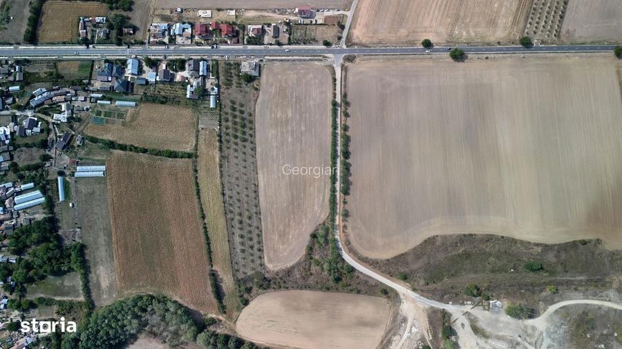 Teren in suprafata de 9654 mp (cu 27m deschidere la strada, la DJ 711) format din 754 mp curti constructii, 1491 mp arabil intravilan si 7409 mp arabil extravilan. Reteaua de electricitate si reteaua publica de apa se afla la capatul terenului dinspre sosea. Terenul este prevazut si cu o fantana cu diametrul de 80cm si adancimea de 30m din care 16m cu apa si camin subteran pt. hidrofor (3m x 1m). Terenul este imprejmuit integral cu stalpi de beton si plasa de sarma. Pe o parte a terenului este plantata o livada de nuc in anul 10, aflata pe rod, distanta intre randurile de nuci fiind de 9m.