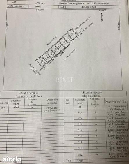 Oportunitate de investitie: Aiveti nevoie sa cumparati un teren intravilan langa Bucuresti?Ei bine acest teren este pentru dumneavoastra !Situat la 35 km de Bucureti, in comuna Dragoesti, jud Ialomita, cu parcelare realizata, loturi de 500 mp si configuratie ideala pentru dezvoltare rezidentiala.Caracteristici teren: Suprafata: 4.700 mp, Nr. cadastral: 407, Regim: intravilan ideal pentru curti constructiiParcelare: 9 loturi (~500515 mp), Acces din drum communal asfaltat;Avantaje:Parcelare existent loturi 500 mp, asta inseamna economie de timp si costuri;Potrivit pentru proiect rezidential mic, acces facil catre Bucuresti in zona linistita, in dezvoltare;Potential investitional:Terenul este ideal pentru: dezvoltatori rezidentiali si investitori tip buy & build pentru proiect de tip mini-cartier.Pret 8 /mp = 37.600