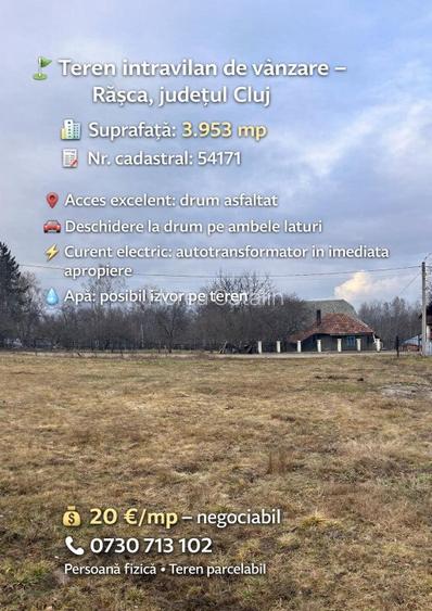 Teren intravilan 3.953 mp Rasca, Cluj ???? Drum asfaltat ???? Drum pe ambele laturi Autotransformator langa teren ???? Posibil izvor ???? Orientare VestEst ???? NC 54171 ???? Pret: 20 /mp negociabil ???? Tel: