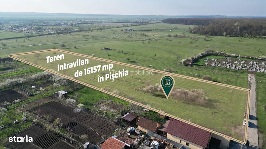 Va propunem spre vanzare un teren intravilan cu suprafata generoasa de 16.157 mp si front stradal de 86 ml, situat intr-o zona foarte bine pozitionata din localitatea Pischia, aproape de zona centrala.Unul dintre cele mai importante avantaje ale acestui teren este potentialul sau de dezvoltare: in prezent, proprietatea este impartita intre intravilan si extravilan, insa in urma actualizarii P.U.G.-ului comunei, terenul va fi inclus integral in intravilan, fiind reglementat ca zona de locuinte. Acest aspect il transforma intr-o oportunitate excelenta pentru investitie sau dezvoltare rezidentiala.Terenul beneficiaza de o amplasare strategica, la doar 350 m de biserica, 580 m de primarie, 700 m de sala de sport si punctele turistice, respectiv 500 m de padure. Este situat pe partea inalta a localitatii, eliminand riscul de inundatii.Accesul este direct din drum asfaltat, iar utilitatile sunt in imediata apropiere: apa la aproximativ 10 m, curent si canalizare la 50 m, iar gazul la circa 200 m.Datorita dimensiunii, pozitiei si perspectivelor urbanistice, acest teren reprezinta o alegere ideala pentru dezvoltatori sau investitori care cauta un proiect cu potential real de crestere.