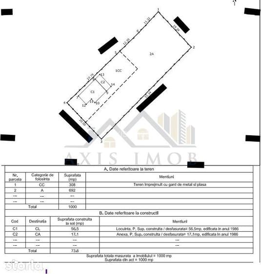 De vanzare Teren intravilan construibil + casa | Matesti Localitate: Matesti Suprafata teren: 1.000 mp Deschidere: 20 ml la strada asfaltata Constructii existente pe teren: Casa (1986) 3 camere - Necesita renovare Suprafata construita la sol: 56,5 mp Suprafata desfasurata: 57 mp Constructie din chirpici Tamplarie din lemn Izolatie exterioara cu polistiren de 10 cm Acoperis din tigla Anexa - Suprafata construita desfasurata: 17,1 mp Teren imprejmuit cu gard metalic si plasa Utilitati: Curent electric Apa pe teren Gaze si canalizare la poartaIdeal pentru constructie locuinta noua sau investitiePret: 39.200 euro (negociabil)Se percepe comision de intermediere imobiliara AXIS IMOB energia noua a imobiliarelor.
