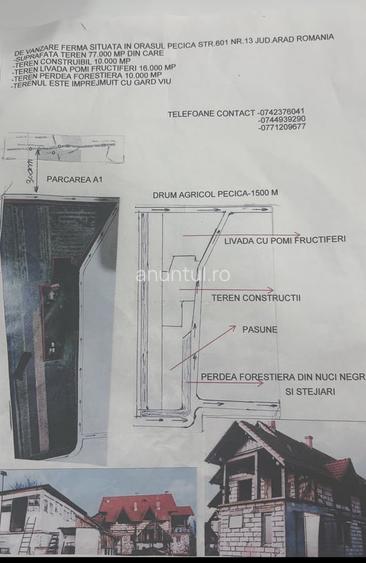 de vanzare ferma situata in orasul pecica, str. 601, nr. 13, jud. Arad, Romania. -suprafata teren 77.000 mp, din care -teren construibil 10.000 mp -teren livada pomi fructiferi 16.000 mp -teren perdea forestiera 10.000 mp -terenul este imprejmuit cu gard viu pret negociabil 220.000 euro